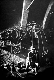 É fácil de entender que esse tipo deinscrição pode ser obtido não apenas pelo movimento do objeto mas também pelo movimento da própria câmera. Com suas fotografias de corridas de automóvel, Lartigue tornou célebre um tipo ainda mais inusitado de inscrição do tempo na imagem, que combina movimento do objeto, da câmera e de alguns de seus mecanismos internos[1]. Vale mencionar também a experiência pioneira de Picasso: com uma lanterna, o artista desenha no ar, deixando registrada na fotografia a trajetória da luz. O resultado é bastante inusitado porque sobrepõe à representação organizada pela câmera uma outra, criada pelo artista e invisível, a não ser como rastro captado pela fotografia. Processo semelhante é explorado pelo fotógrafo esloveno Evgen Bavcar (1992), cego desde a infância, quando esculpe com a luz formas que capta por meio do tato: são carícias da luz, como sugere no título de algumas de suas obras.